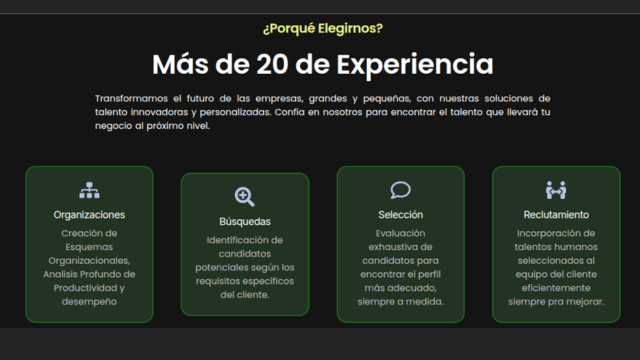 Transformamos el futuro de las empresas, grandes y pequeñas, con nuestras soluciones de talento innovadoras y personalizadas. Confía en nosotros para encontrar el talento que llevará tu negocio al próximo nivel.